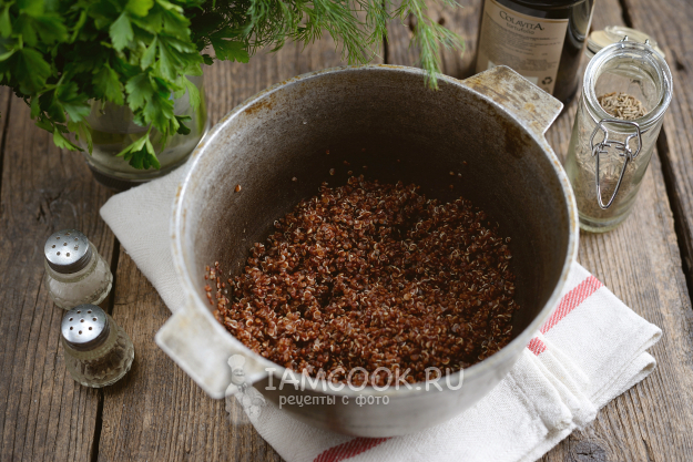 Постарайтесь аккуратно промыть крупу, она очень легкая и сразу всплывает на поверхность, поэтому сливать грязную воду достаточно проблематично. Залейте киноа в пропорции 1 к 2, варите на тихом огне около 20 минут до полного выкипания воды. Дальше оставьте ее под крышкой в казане, пока не остынет.