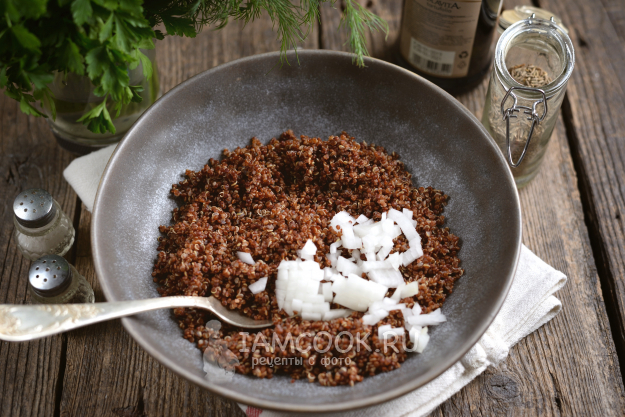 Переложите остывшую киноа в большую удобную миску, добавьте мелко нарубленный репчатый лук. Я использовала белый салатный сорта "стерлинг", он сочный и сладкий. При желании репчатый можно заменить зеленым.