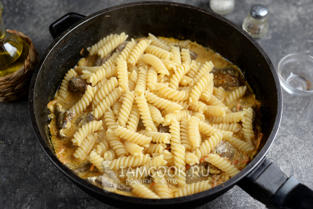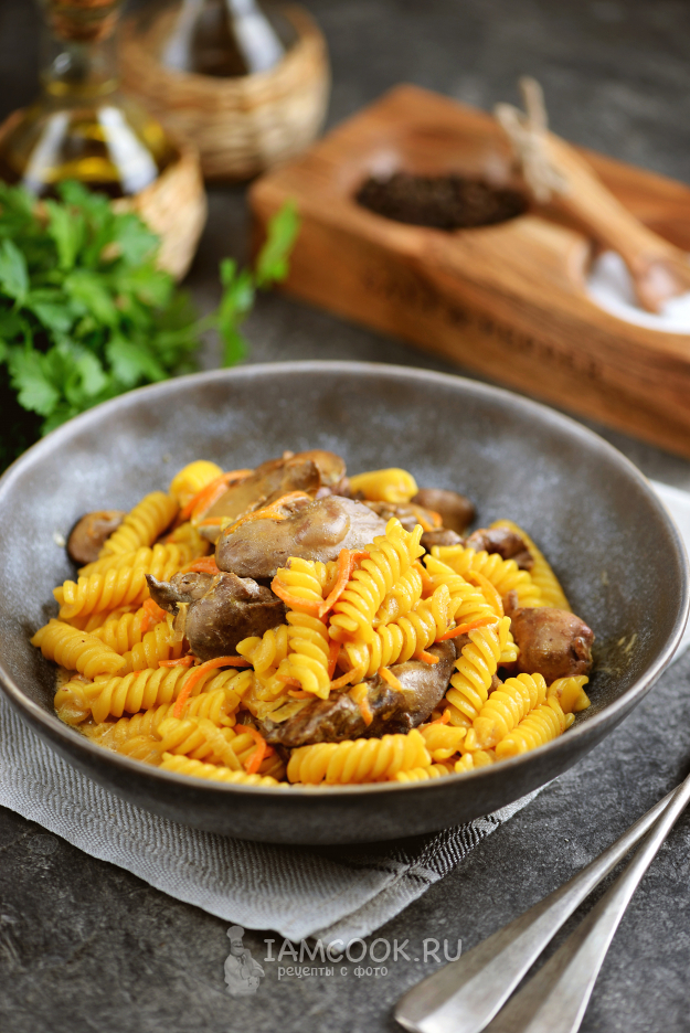 Куриная печень в сметане с макаронами готова. Разложите по порциям, полейте вкуснейшим соусом и подавайте к столу.