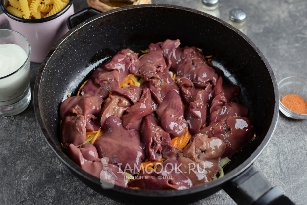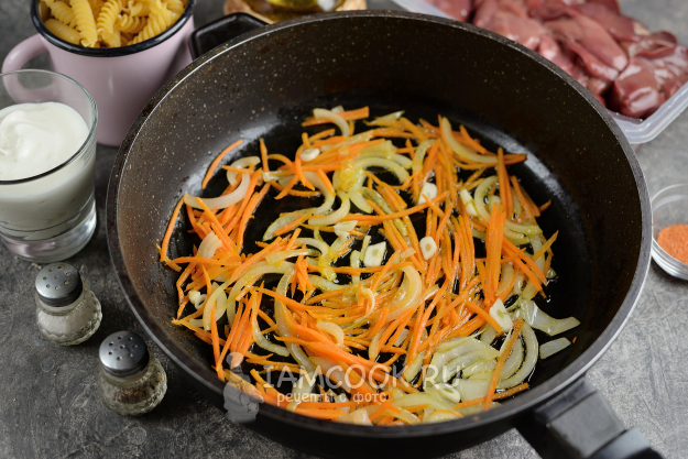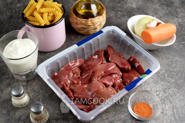 Возьмите все продукты для приготовления куриной печени в сметане с макаронами по списку. Лук, морковь и чеснок очистите, помойте. Печень зачистите от пленок, разрежьте на две части, аккуратно помойте и тщательно просушите бумажными полотенцами.