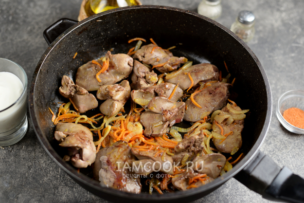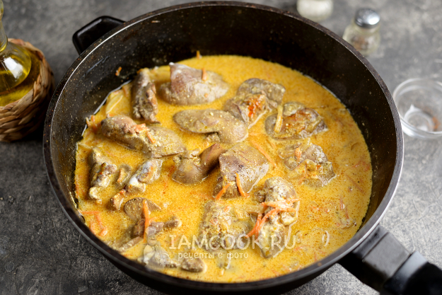 Сметану слегка разведите кипяченой водой из чайника, влейте в сковороду, добавьте приправу для птицы. Тушите печень в соусе еще минуты 3-4 на тихом огне.