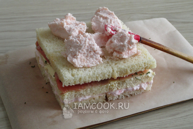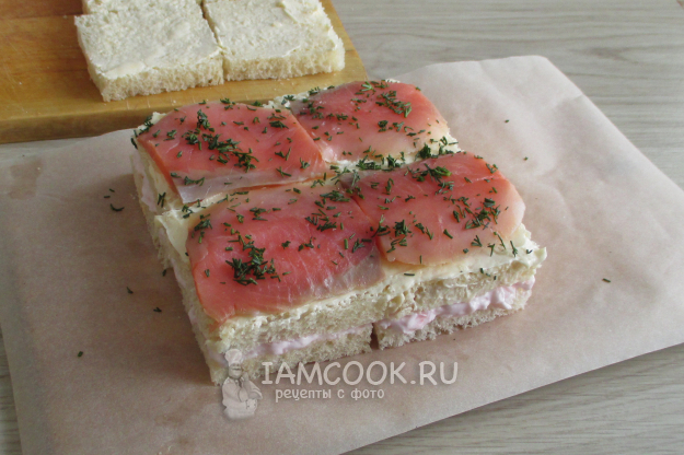 Затем укройте кусками, хорошо намазанными сливочным маслом. Разложите ломтики красной слабосоленой рыбой (тут кета) и по желанию посыпьте свежей рубленой зеленью, можно полить соком лимона. Сверху укройте снова хлебом, слегка промазанным сливочным маслом, т.е. вокруг рыбной нарезки будет масло. Придавите, чтобы хлеб и начинки хорошо соединились.