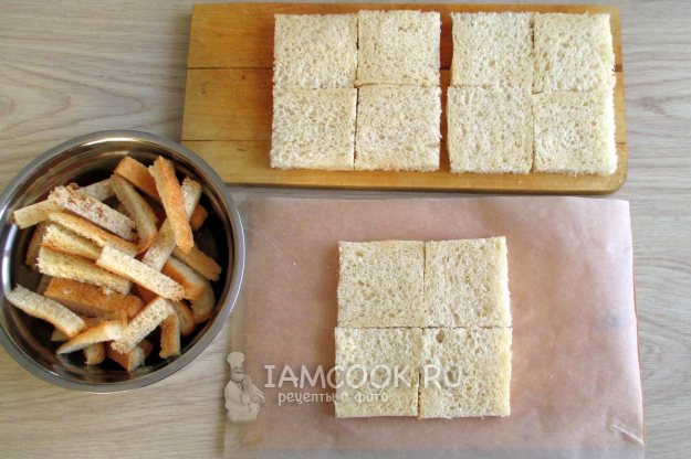 У меня нарезанный белый хлеб и с каждого ломтя я убрала корочки, придавая заготовкам квадратный вид. Планировала купить хлеб для тостов, он очень хорошо пропитывается, но его уже несколько дней не вижу в нашем сельмаге...