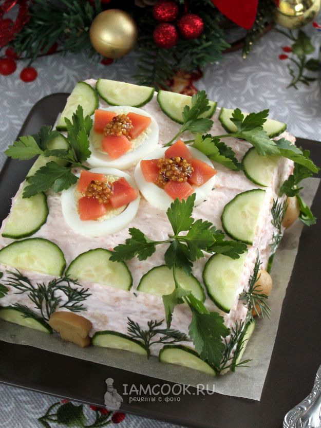 Оформите поверхность торта на свой вкус: например, элементами из крутого яйца, маринованных шампиньонов, кусочков рыбы, зернистой горчицы и веточками свежего укропа и петрушки.