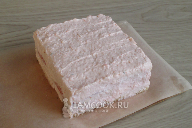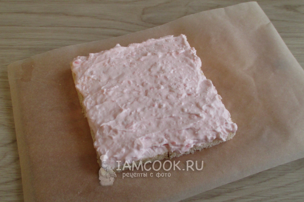 Первый слой будущего торта из четырех квадратных кусков хлеба промажьте пастой из морепродуктов (тут в составе вареные кальмары и креветки).