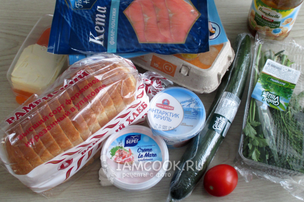 Для холодного скандинавского рыбного бутербродного торта подготовьте ингредиенты по списку к рецепту.