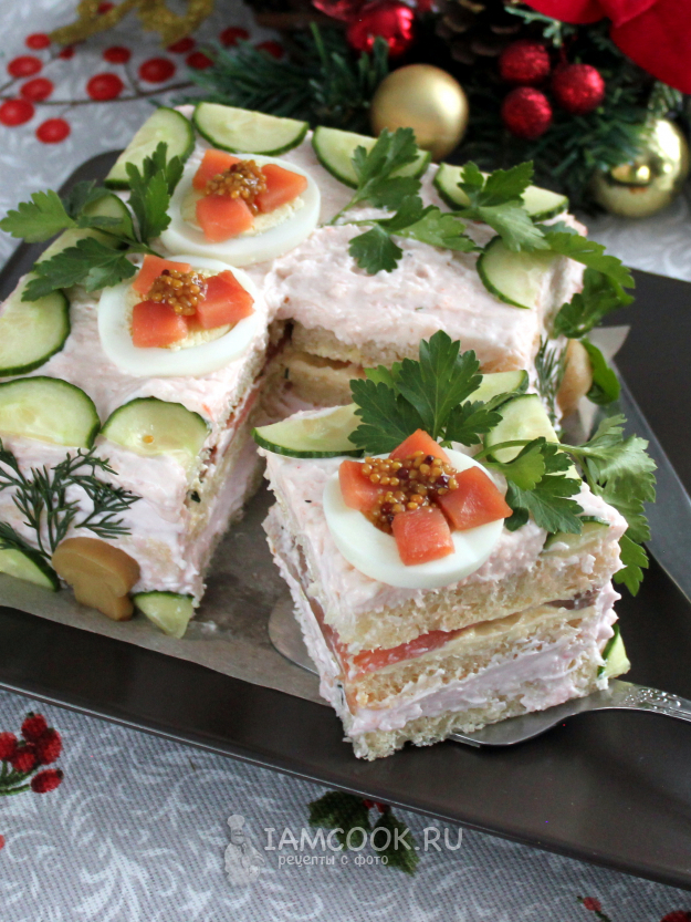 Хлеб подходит разный: буханка белого, специальный для тостов, а также и ржаной или цельнозерновой. Хоть круглый в виде каравая, который нужно нарезать на заготовки вдоль; хоть прямоугольный, тогда можно нарезать либо на маленькие заготовки поперек, либо на большие вдоль. Главное, чтобы собрался торт из трех или более слоёв!