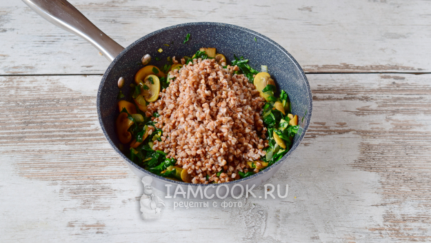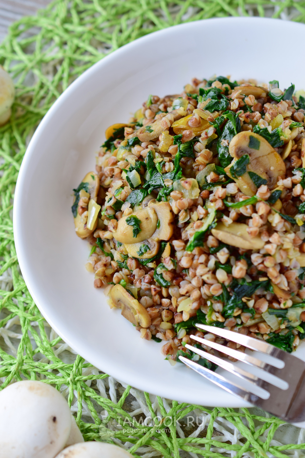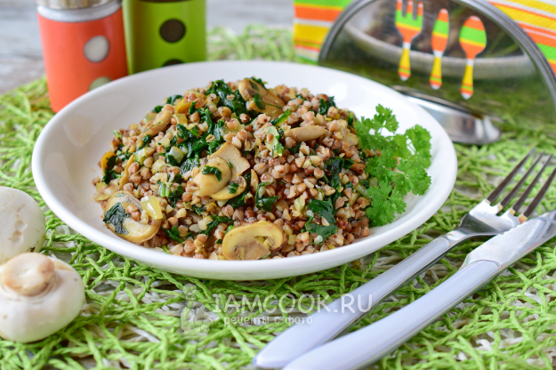 Гречка с грибами и шпинатом готова! Подаем порционно с салатом из свежих овощей или соленьями.