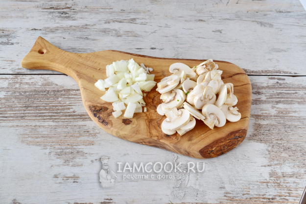 Тем временем лук нарезаем мелким кубиком, шампиньоны порежем пластинами.