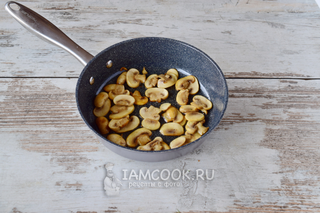 В сковороде разогреваем растительное масло и обжарим на нем шампиньоны минут 5-6, помешивая, чтобы они подрумянились.