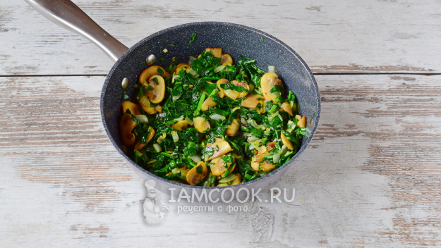 Добавляем шпинат в сковороду и готовим еще 3-4 минуты.