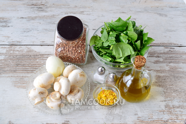Продукты для приготовления гречки с грибами (шампиньонами) и шпинатом возьмём по списку. Шпинат можно использовать и свежий, и замороженный, шампиньоны можно заменить вешенками. Приправу используйте свою любимую, у меня - грибная, но можно взять и приправу для каш.