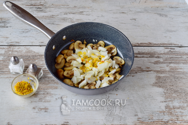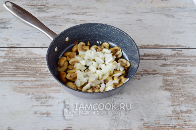 Добавляем лук к грибам и жарим овощи вместе, помешивая, еще 5 минут - до прозрачности лука.