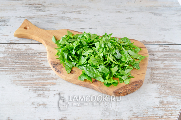 Шпинат перебираем, моем, обсушиваем бумажными полотенцами. Нарезаем шпинат помельче.