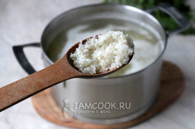 Затем добавить в суп промытый в нескольких водах рис. Сразу же перемешать, чтобы он не прилип ко дну, и варить всё вместе 5 минут.