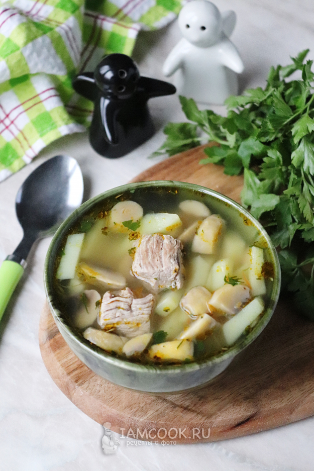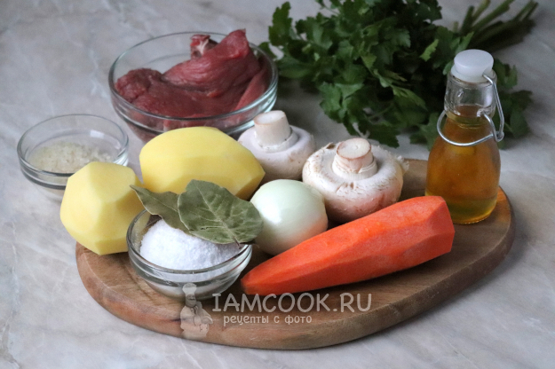 Для приготовления грибного супа с говядиной и шампиньонами подготовить из списка необходимые ингредиенты.