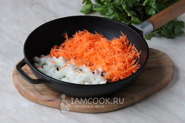 Тем временем почистить все овощи и грибы. Лук нарезать кубиками, морковь натереть на тёрке со средними ячейками. Подготовленную нарезку выложить на сковороду с растительным маслом и жарить, периодически помешивая, до золотистого цвета.