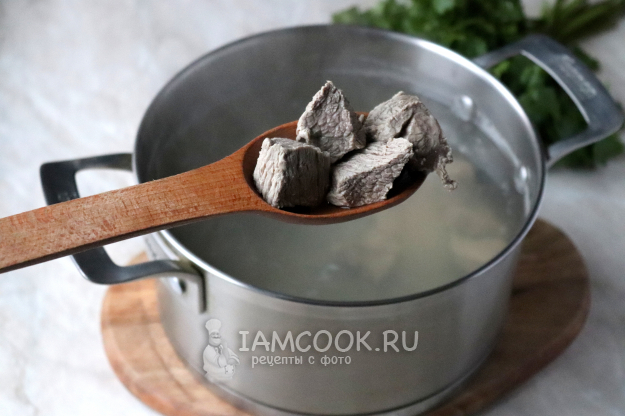 Мясо промыть под холодной проточной водой, зачистить от всевозможных плёночек/прожилок и нарезать порционными кусочками небольшого размера. В подходящей кастрюле вскипятить воду и выложить говядину, довести жидкость до повторного закипания и снять образовавшуюся пену. Варить бульон на минимальном огне до мягкости мяса, на это уйдёт от 40 до 60 минут (может, и дольше, в зависимости от возраста животного).