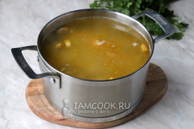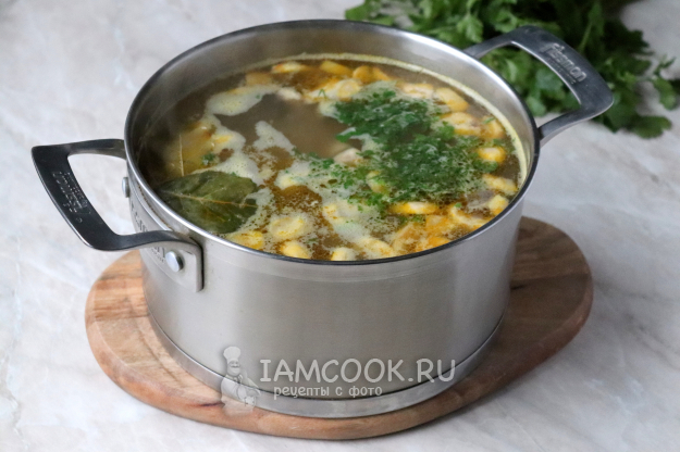 За 2-3 минуты до готовности добавить в суп лавровый лист и мелко нарезанную зелень.