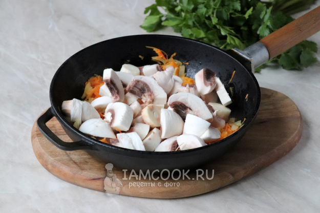 Затем к обжаренным овощам добавить шампиньоны, нарезанные толстенькими слайсами. Грибы сразу же пустят много сока, а когда он выпарится - начнут поджариваться.