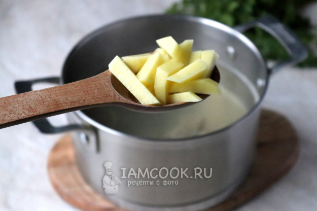Когда мясо будет готовым, в кастрюлю выложить картофель, нарезанный соломкой или кубиками (как вам больше нравится). Проварить 5 минут и добавить специи по вкусу.