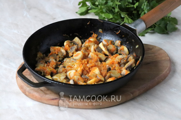 Отправить в кастрюлю грибы с луком и морковью. Дождаться, когда жидкость снова закипит, и варить 10 минут.