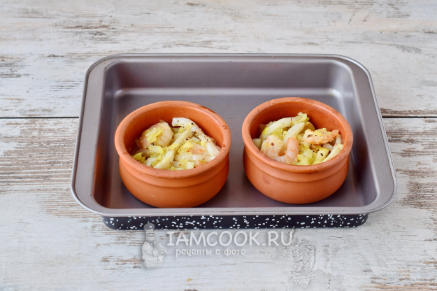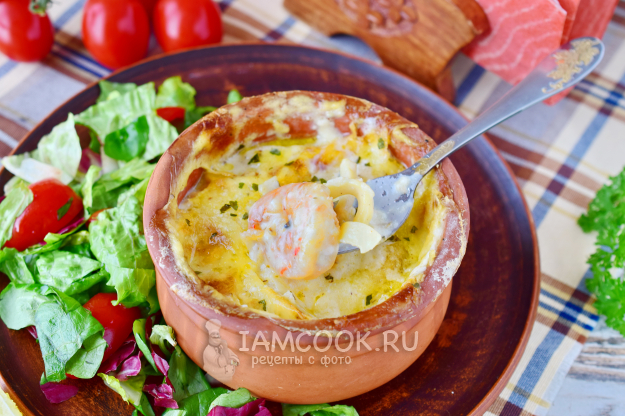 Хорошо все перемешиваем и выкладываем морепродукты либо в кокотницы, либо в любые имеющиеся в доме огнеупорные порционные формочки.