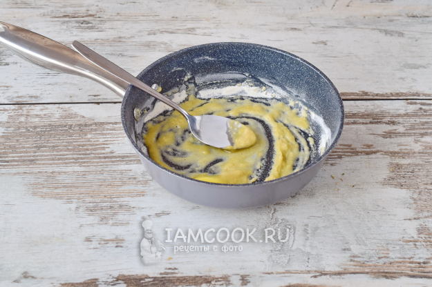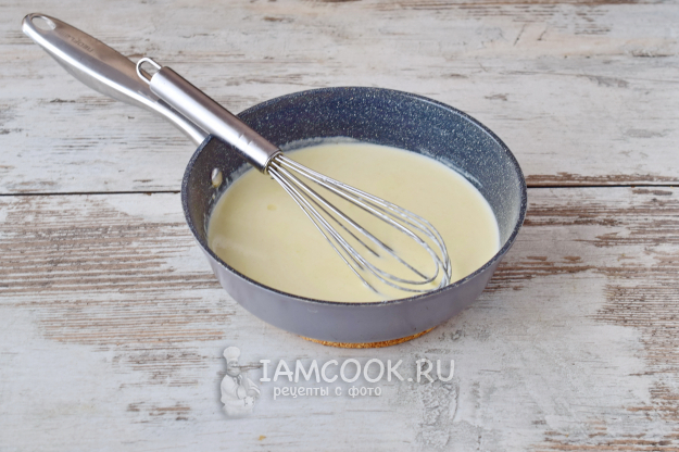 Теперь понемногу подливаем в сковороду сливки и быстро и активно размешиваем венчиком соус, чтобы получалась гладкая масса.