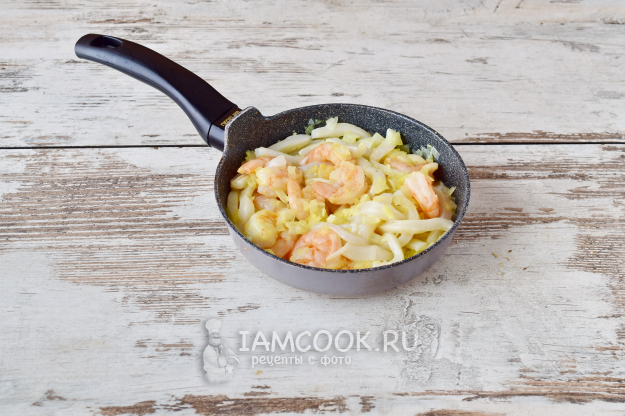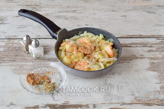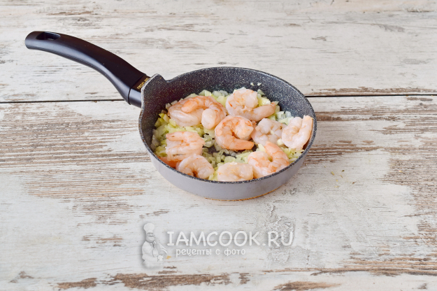 Добавим креветок и продолжаем жарить, помешивая, еще минут 5.
