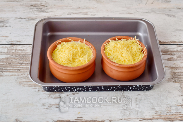 Сверху выкладываем натертый сыр. Отправляем формочки с жульеном в разогретую до 170°С духовку на 30-35 минут.