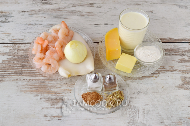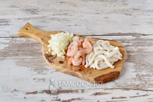 Приготовление жульена начнем с подготовки продуктов. Желательно купить уже очищенных креветок и кальмаров. Если же нет такой возможности, тогда с креветок снимаем панцири и отрываем головы. С хвоста удаляем кишечные вены. Из кальмара достаем хитиновую пластину. После этого промываем креветок и кальмаров под проточной водой и обсушиваем бумажным полотенцем.