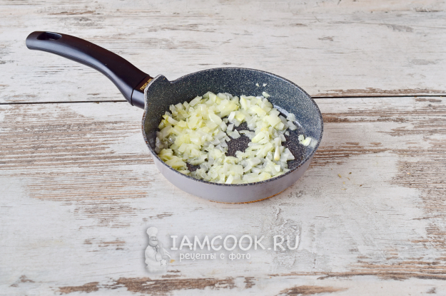 В сковороде растопим половину сливочного масла и обжарим лук до прозрачности, минут 5-6, помешивая.