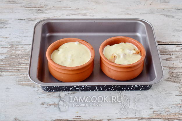 Заливаем наши морепродукты сливочным соусом. Следите, чтобы формочка не была полной, иначе в процессе приготовления часть соуса может вылиться из формы.