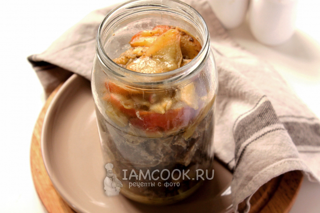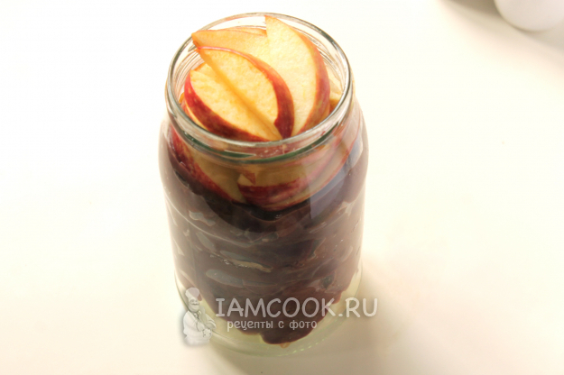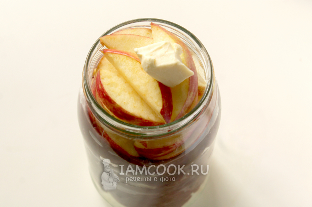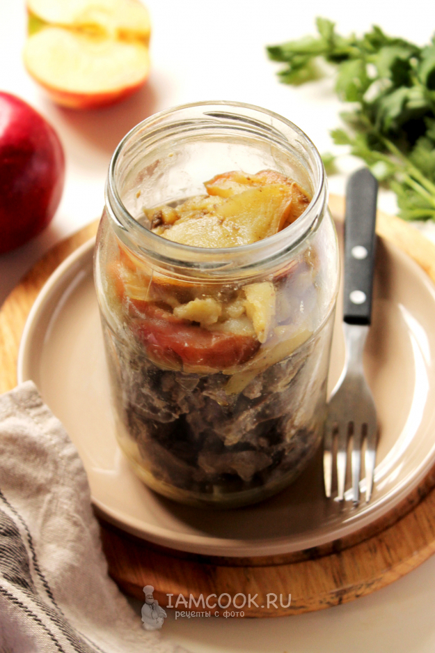На дно банки уложите репчатый лук, затем — куриную печень, накройте все яблочными дольками.