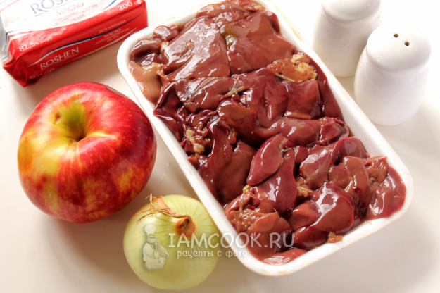 Возьмите продукты для приготовления куриной печени с яблоками в банке в духовке.