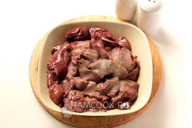 Обработайте куриную печень. Промойте, удалите «неликвид». Приправьте солью и молотым перцем. Возможны разные специи по вашему вкусу.