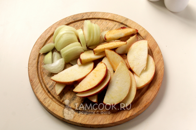 Дольками нашинкуйте яблоки, полукольцами или перьями — репчатый лук.