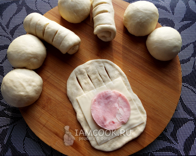Когда тесто увеличится вдвое, можно формировать булочки. Ветчину тонко нарезать.