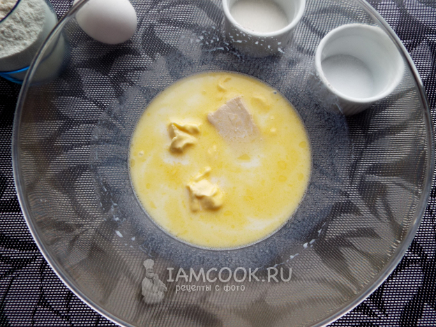 Растворить в теплом молоке сахар, масло и дрожжи. Оставить на 10 минут.