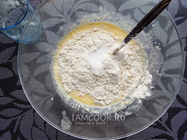 Добавить половину яйца, перемешать. Высыпать муку и соль.