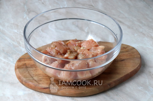 Куриное филе тщательно помойте под холодной проточной водой, обсушите и нарежьте порционными кусочками небольшого размера. Выложите мясо в миску, добавьте специи, выдавленный через пресс чеснок и перемешайте. Оставьте на 10-15 минут при комнатной температуре.