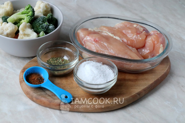Подготовьте все необходимые ингредиенты для приготовления куриного филе в духовке с замороженными овощами. Овощи можете использовать абсолютно любые, у меня - смесь, состоящая из брокколи, цветной капусты, стручковой фасоли и морковки. То же самое касается и специй - выбирайте те, которые вам больше всего нравятся по вкусу и аромату.