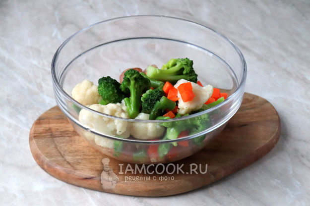 Затем к мясу добавьте замороженные овощи. Если на них много льда - можете ополоснуть их водой. Также немного подсолите и перемешайте.