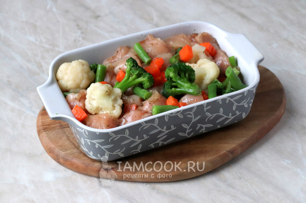 Куриное филе с овощами переложите в жаропрочную форму. Накройте её фольгой и отправьте в духовку (никакой жидкости добавлять не нужно, блюдо будет готовиться в собственном соку).