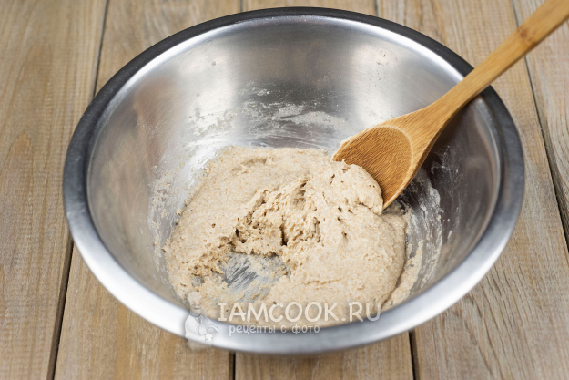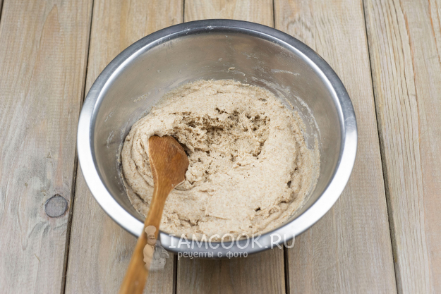 Перемешаем. Должна получиться очень густая смесь. Накроем миску с этой смесью полиэтиленовой пищевой пленкой и оставим в удобном месте на кухне при комнатных условиях (23-24 градуса) на ночь.