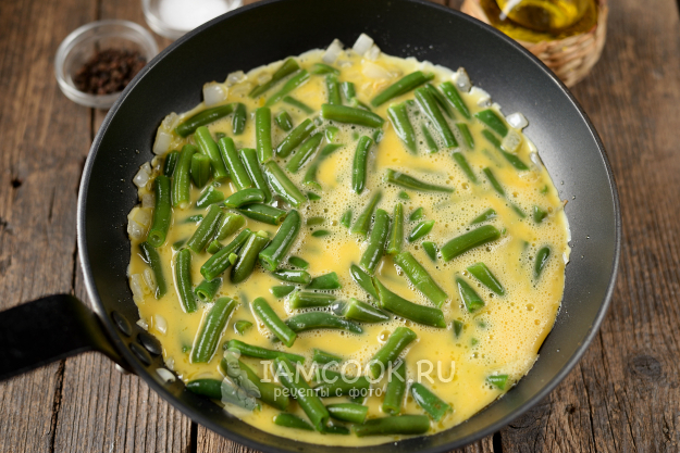 Дальше выложите фасоль в сковороду, сразу же влейте взбитые яйца.