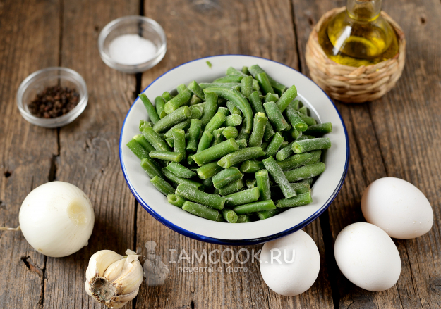 Подготовьте все продукты для жареной стручковой фасоли с яйцом. Лук и чеснок почистите, помойте. Фасоль можно не размораживать предварительно, в кипятке это будет быстрее.