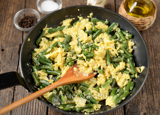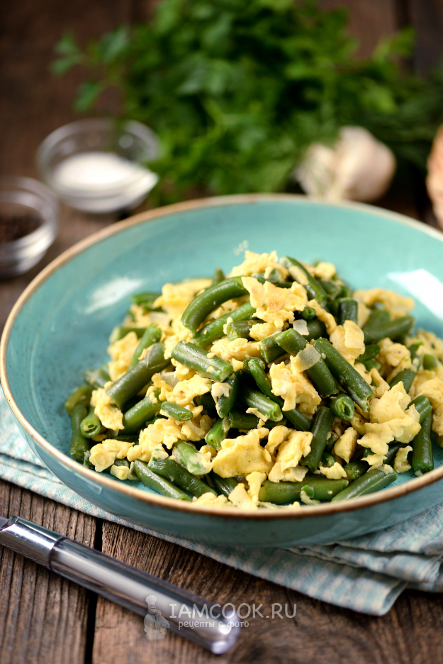 Сразу же переложите жареную стручковую фасоль с яйцами в удобную тарелку и подавайте к столу на завтрак.
