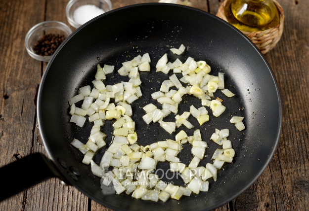 Разогрейте в сковороде немного растительного масла, выложите в него нарезанный кубиком лук и чеснок. Жарьте на умеренном огне несколько минут до золотистого цвета.