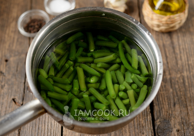 Вскипятите воду в кастрюле, выложите в нее фасоль, варите 3-4 минуты. Спустя время слейте кипяток, фасоль залейте ледяной водой, а если в морозилке лежит лед, то можно положить и его пару-тройку кубиков. Когда фасоль полностью остынет, откиньте ее на дуршлаг и дайте полностью стечь воде.